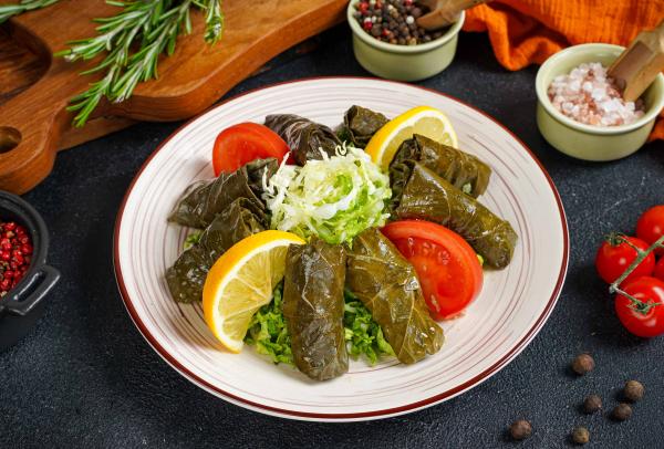 Нежный говяжий фарш, приправленный специями, и рис, завернутые в виноградные листья, подаются с пекинской капустой, лимоном и помидорами. Оливковое масло придает блюду пикантность.