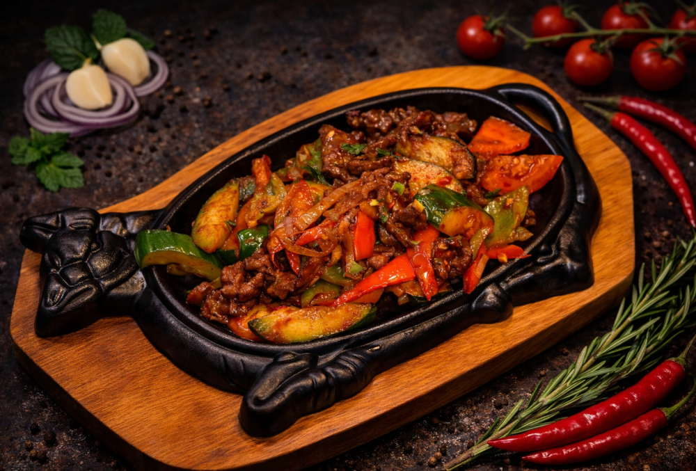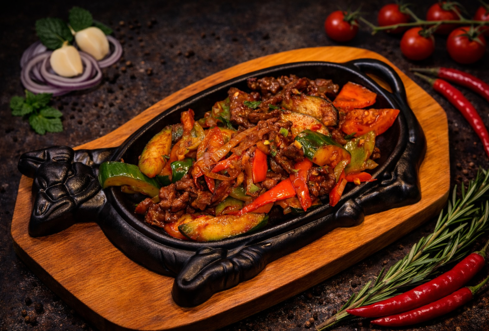 Аппетитное и сытное блюдо, которое идеально подойдет для обеда или ужина. Подается в традиционной чугунной жаровне, что придает особую изюминку и сохраняет сочность ингредиентов.